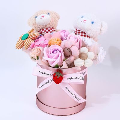 Una bambola, una pianta in vaso, sapone, un bouquet, una statua finita per il regalo di compleanno di una ragazza per il suo migliore amico